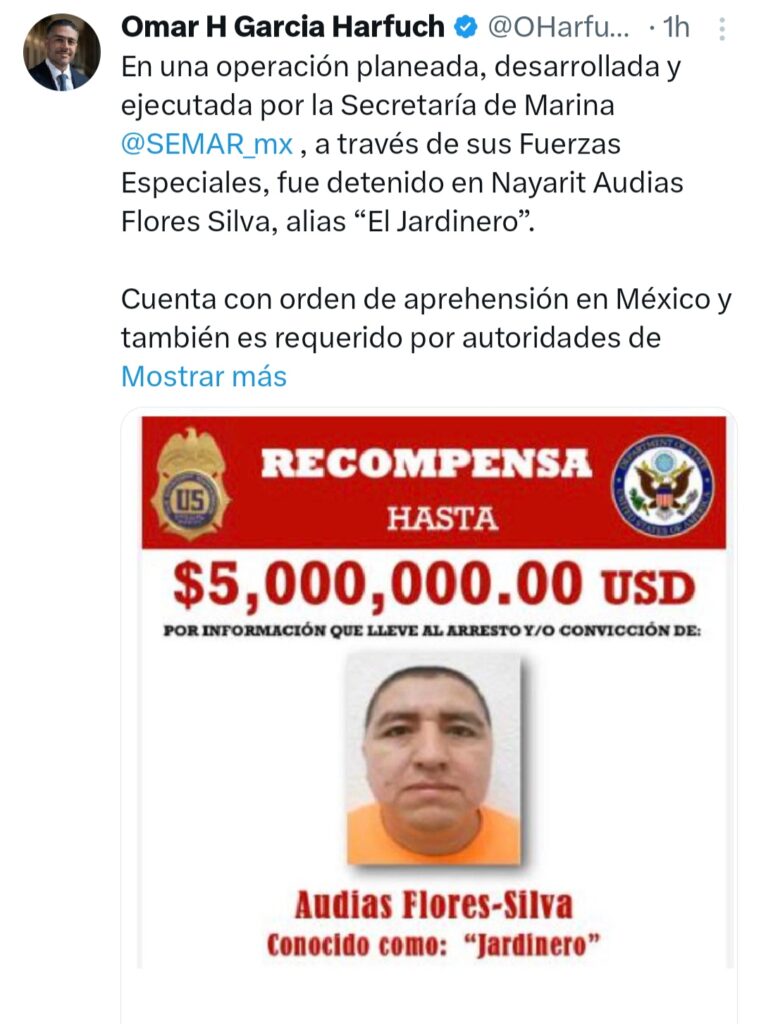 El titular de la Secretaría de Seguridad y Protección Ciudadana, Omar García Harfuch, confirmó la detención a través de un mensaje oficial.